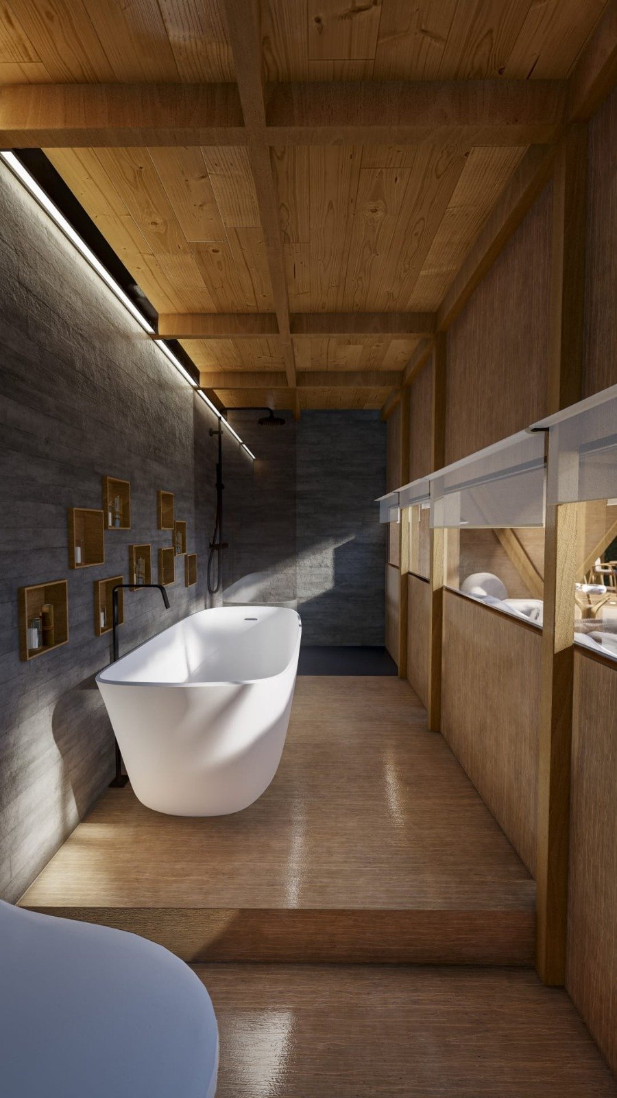 Baño: Módulo “Wet-Pod” integrado (Bañera exenta + Ducha + WC + Lavabo) sin obra húmeda.
