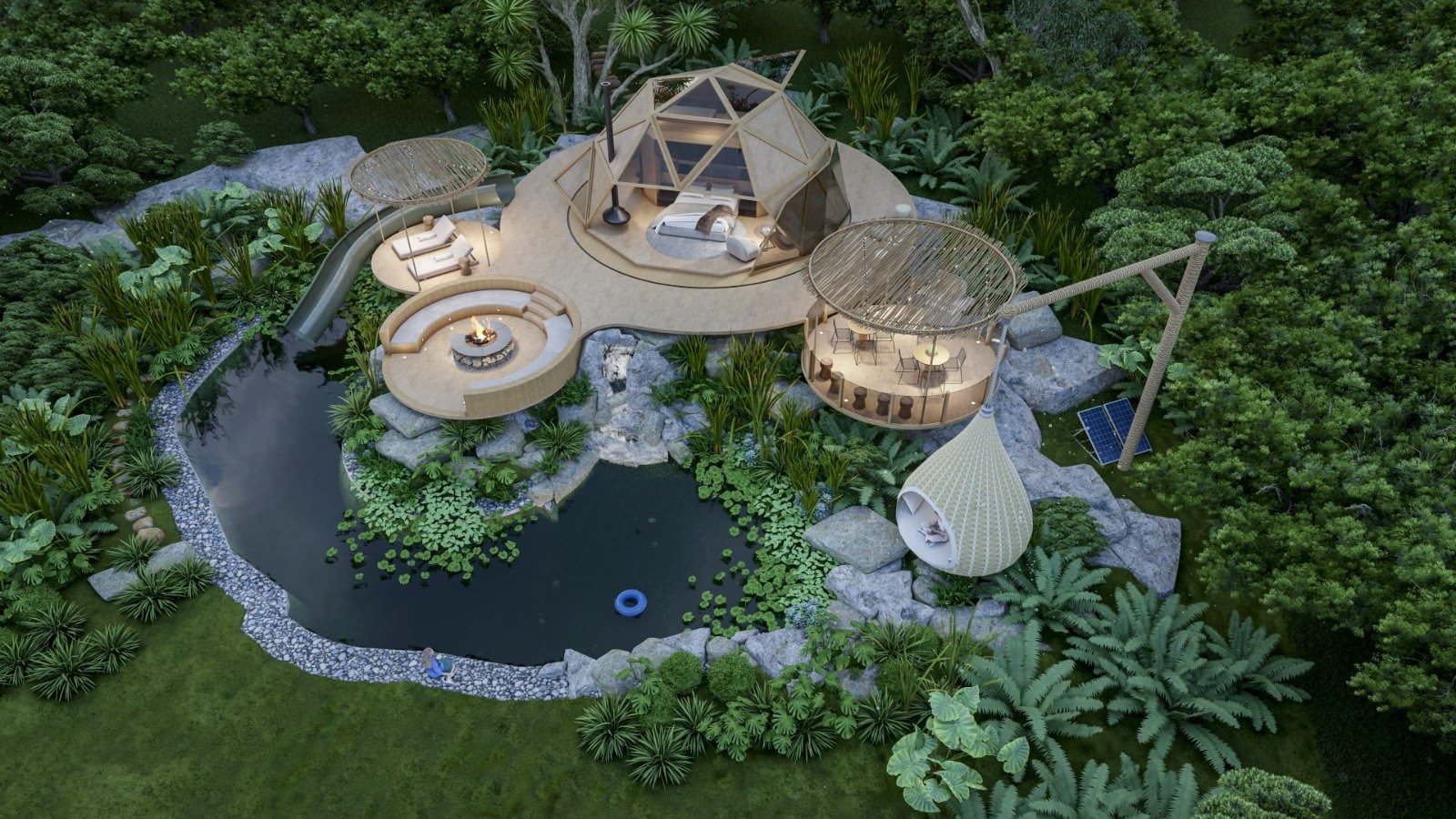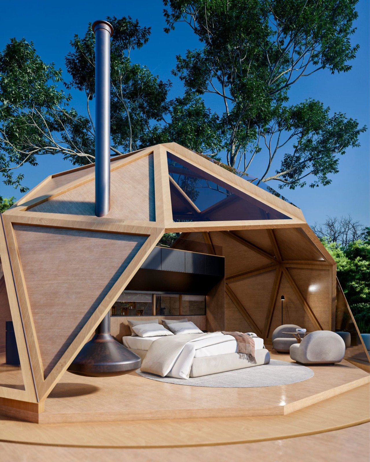 El resultado es un pabellón que combina volumen arquitectónico, eficiencia funcional y capacidad de alojamiento, diseñado específicamente para desarrollos de turismo de naturaleza de alto nivel.